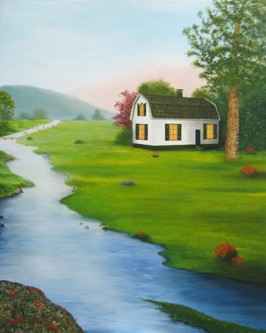 In my landscapes I begin by painting the background, then I go on creating the foreground. This makes my process to paint easier, this way when I paint the foreground I can use the color in a more or less transparent way because under I have already a color, I can take advantage of the color of the background and create different nuances putting another transparent color over.